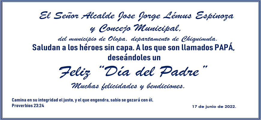 Posted in NoticiasFeliz «Día del Padre»17 de junio de 2022by Municipalidada de Olopa Navegación de entradas Prev PostEntrega de mantas y revisión de bordados en Caserío Los Mansilla, Tuticopote Centro.16 de junio de 2022 - Municipalidada de OlopaNext PostPavimento en carretera hacia el Caserío la Casona y varios tramos en la Aldea El Guayabo22 de junio de 2022 - Municipalidada de Olopa Deja una respuesta Cancelar la respuestaYou must be logged in to post a comment.